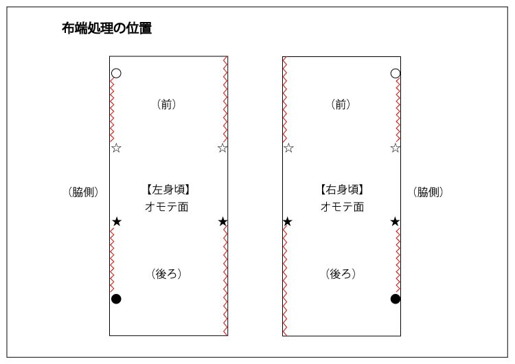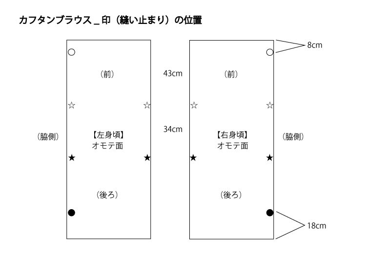 前身頃部分が上になるようにパーツを並べて置きます。上辺から43cmのところ(☆)と、そこから34cmのところ(★)にチャコペンで印をつけます。タテ4辺すべてに印をつけましょう。