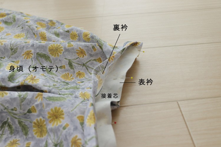 このとき、接着芯を貼った表衿と縫い合わせるようにしましょう。