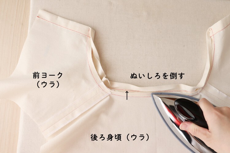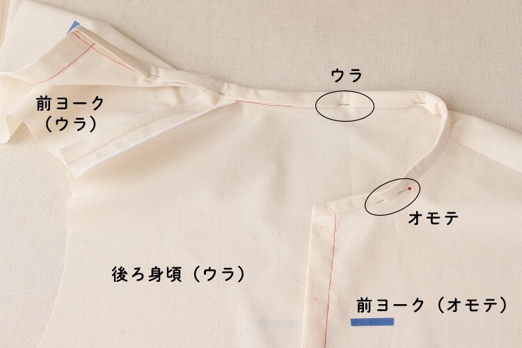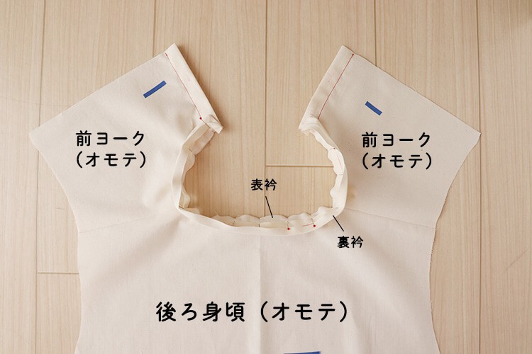 前ヨークと後ろ身頃を中表に重ね、肩を縫い合わせます。