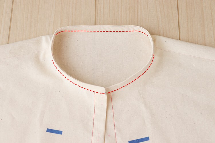 本体身頃と衿を中表に重ね、ぬいしろ1cmで縫い合わせます。