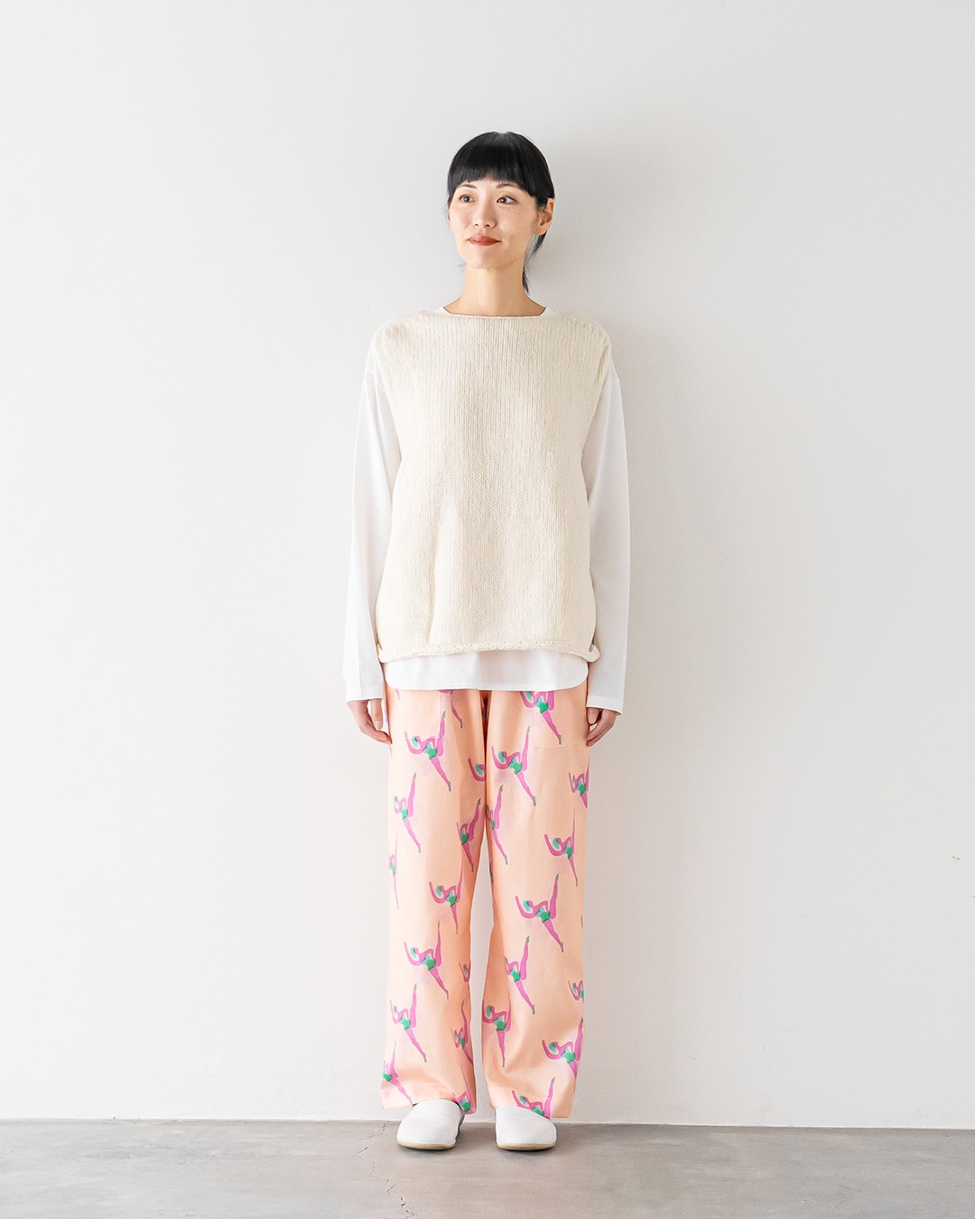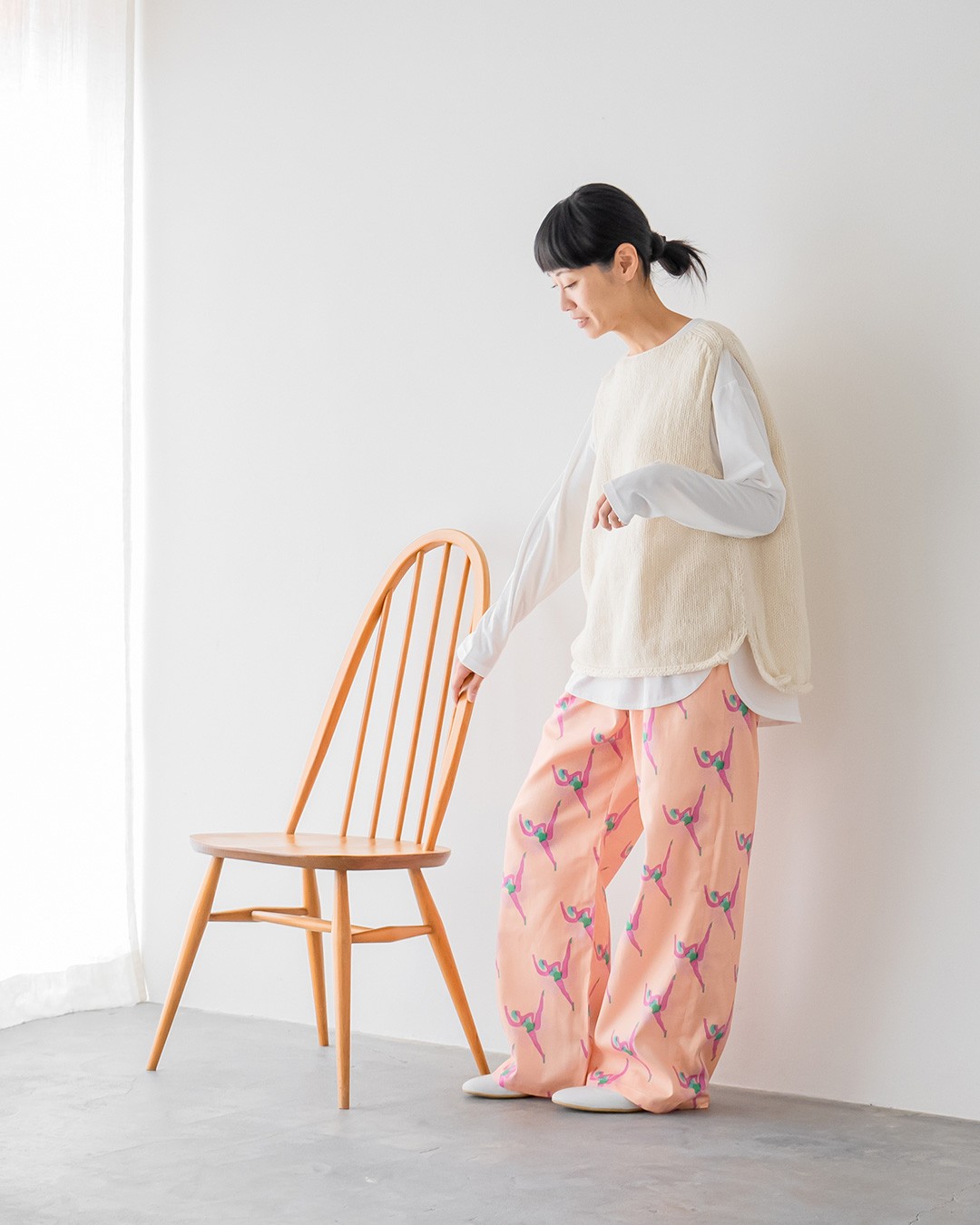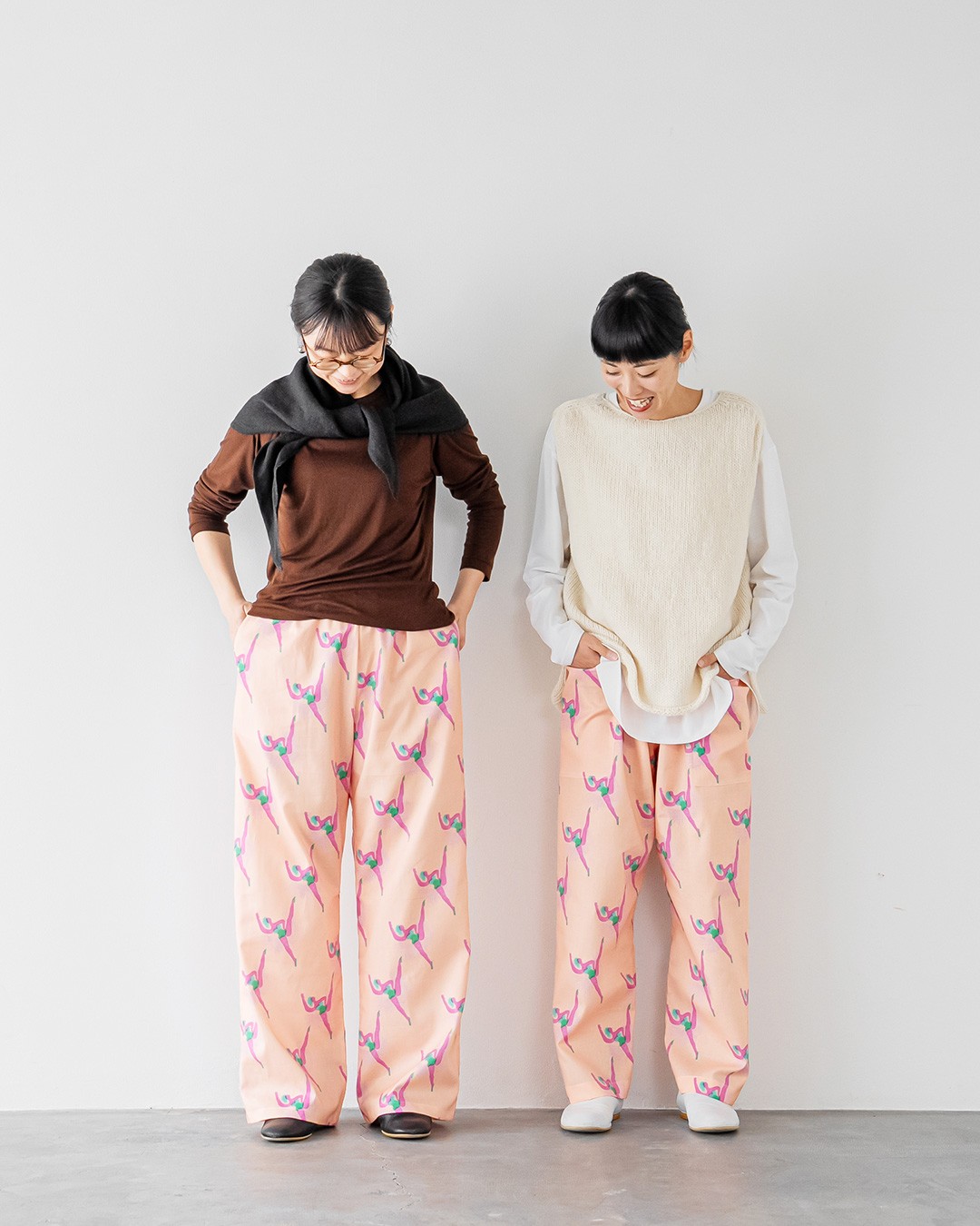 同一柄で作ったサンプルを同一人物に履いてもらいました。生地素材はどちらもコットンリネンビエラ。柄は、nunocoto fabricのラインダンス(サーモンピンク)です。イージーパンツは、わたり幅だけじゃなく、パンツ丈も きほんのストレートパンツに比べて少し長めです。