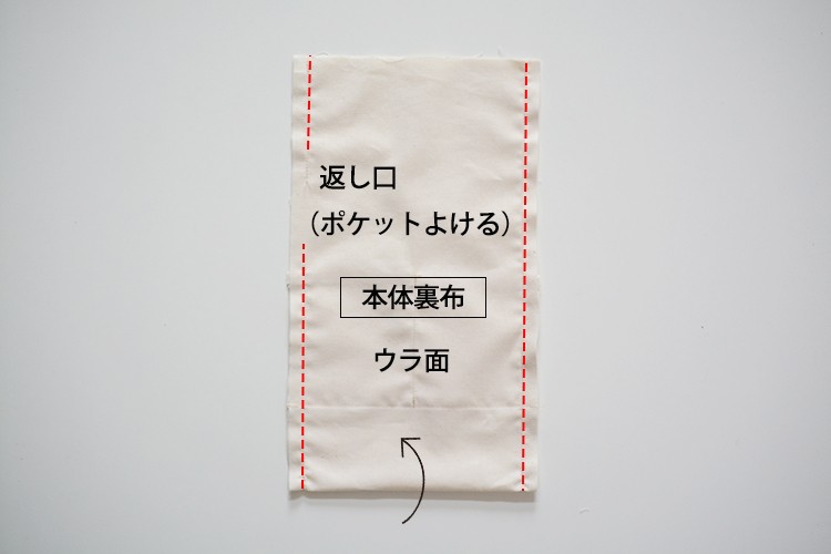 本体裏布オモテ面の上から15cmのところにポケットの下部分を縫い付けます。