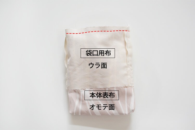 本体表布上端と袋口用布下端(ひも通し口がない方)を中表で合わせ、ぬいしろ1cmでぐるりと1周縫い合わせます。