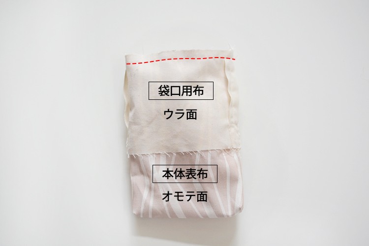 袋口用布を縫い付けた本体表布と裏布を中表で合わせます。