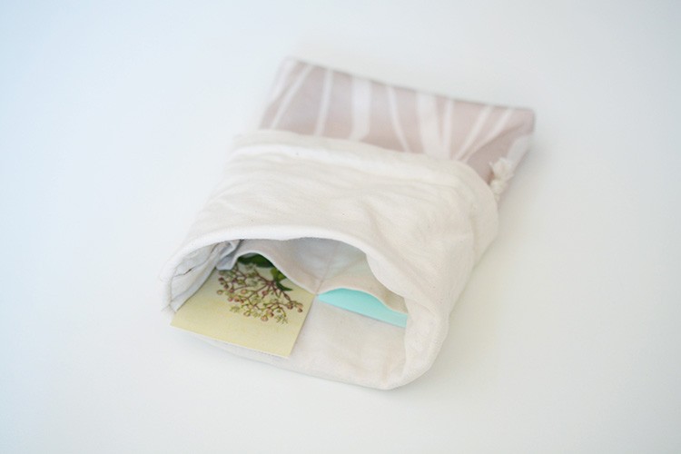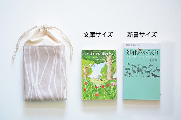 中に文庫本を入れ、キュッと袋口を絞って使いましょう。