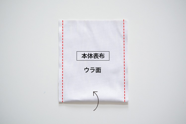 本体表布を中表で半分に折り、両側をぬいしろ1cmで縫い合わせます。