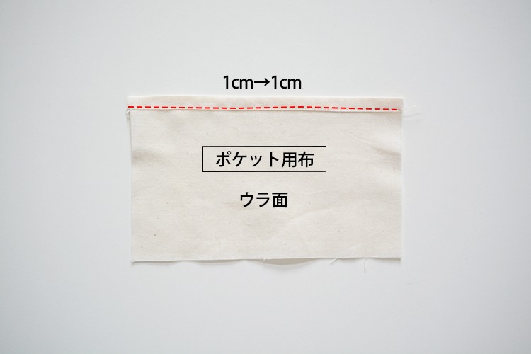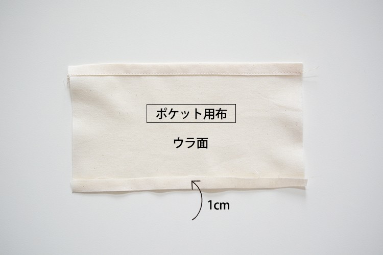 ポケット用布の上辺を、ウラ面側に1cm→1cmで三つ折りしてステッチします。