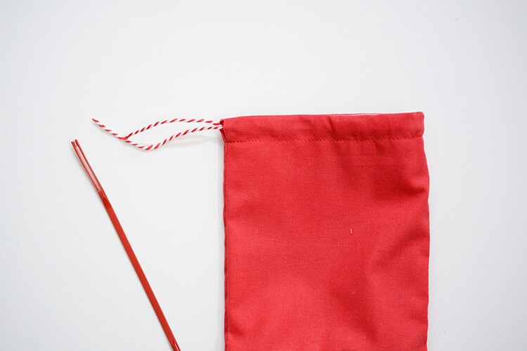 ひもを揃えて結んだら、サンタ帽の巾着袋のできあがりです。