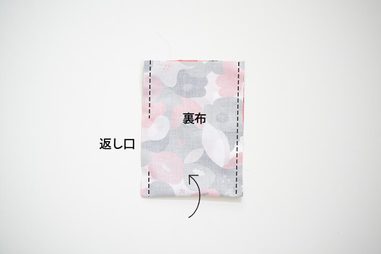 裏布を中表で半分に折り、両側をぬいしろ1cmで縫い合わせます。