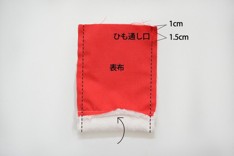 この時、片側だけ、上から1cm~1.5cmの部分を縫わずに開け、ひも通し口を作ります。