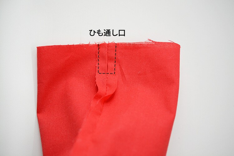 ひも通し口部分のぬいしろを開き、コの字にステッチします。