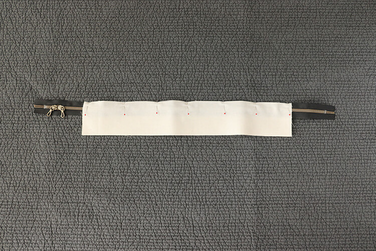 ふた布2枚を中表に合わせ、ファスナーを挟みます。