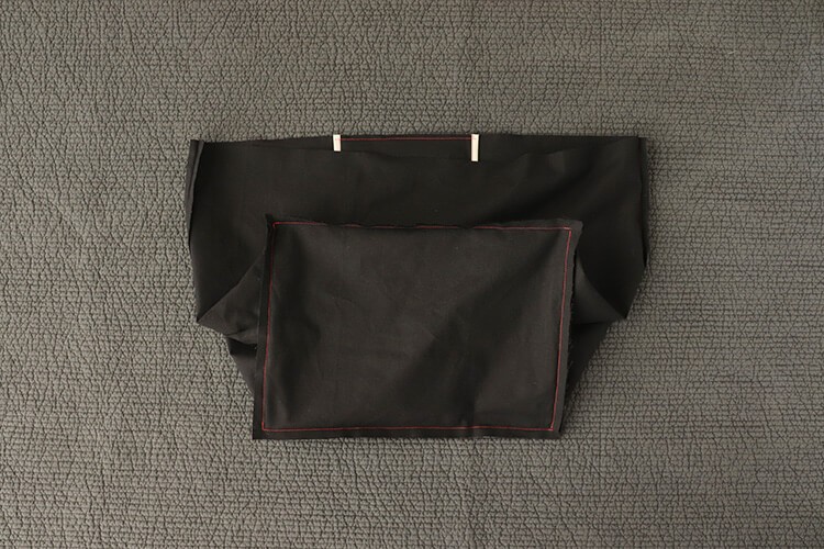 袋口の合印にポケットを合わせ、5mmで仮留めしましょう。