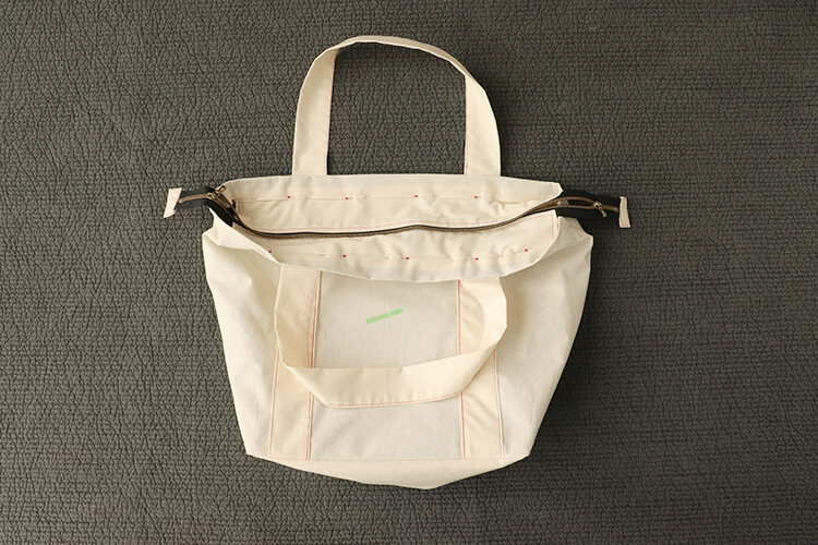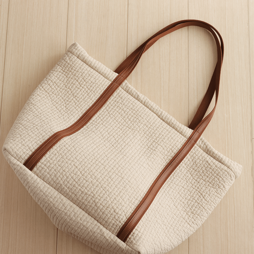 たっぷりのマチ幅で裏地つきの、シンプルなトートバッグの型紙(パターン)です。袋口にファスナーがついて、ちょっとした旅行にもオススメ。