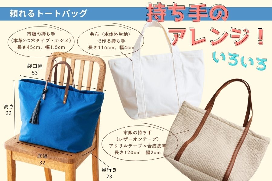 持ち手は、サンプルのように、市販のバッグ持ち手を使ってもよいでしょう。持ち手を作る手間が省けますし、既製品のように見えやすいのがメリットです。
