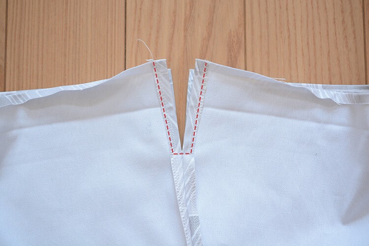 この時、袋口の三つ折りの下端から1cmの部分を縫い止まりとしてください。(写真参照)