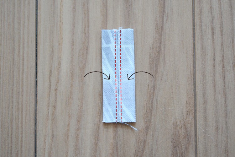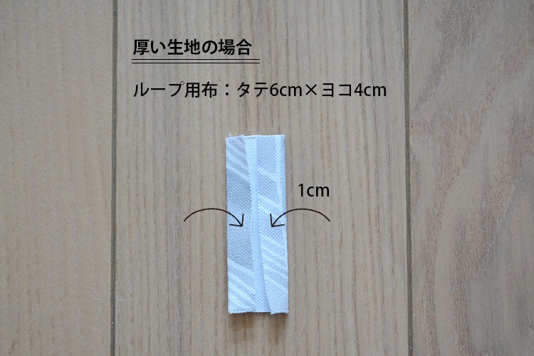 ループ用布をタテ6cm×ヨコ4cmにカットし、両側を1cmずつ折ったらステッチしましょう。