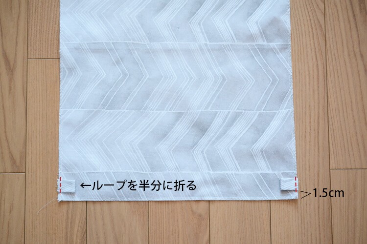 ループ(タブ)を半分に折り、片方の本体用布の、下から1.5cmの両側に縫い付けます。(写真参照)