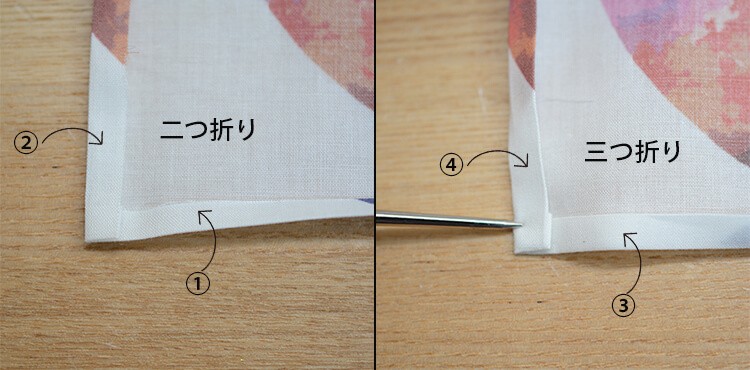 角は、いったん開いて二つ折り状態にし、タテヨコ交互に折って三つ折りにします。(写真参照)