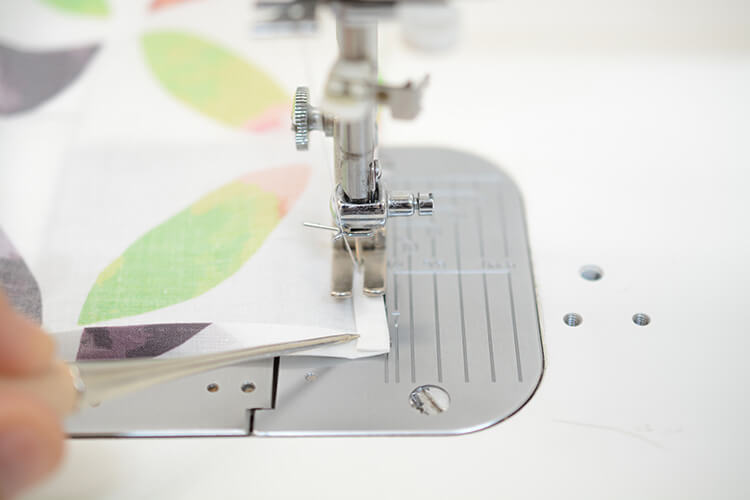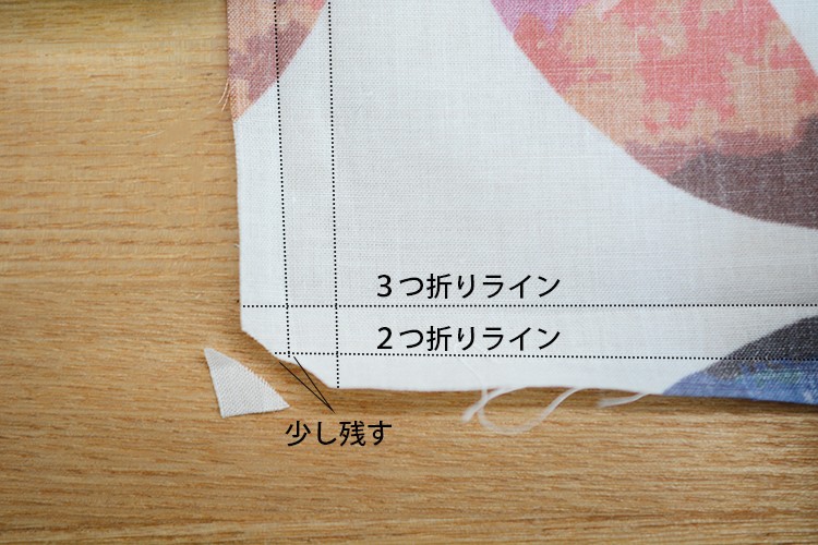厚めの生地を使う場合は、いったん折り目の角を少しだけ切り落とすと、角が分厚くなりすぎず縫いやすいですよ。
