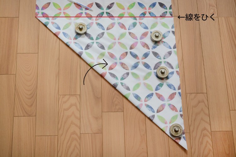 角を支点にヨコ辺をタテ辺に合わせるように斜め半分に折り、布にそってチャコペンでヨコ辺をひきます。
