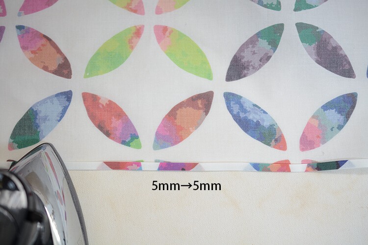 4辺を5mm→5mmで三つ折りし、アイロンでしっかりと折り目をつけます。