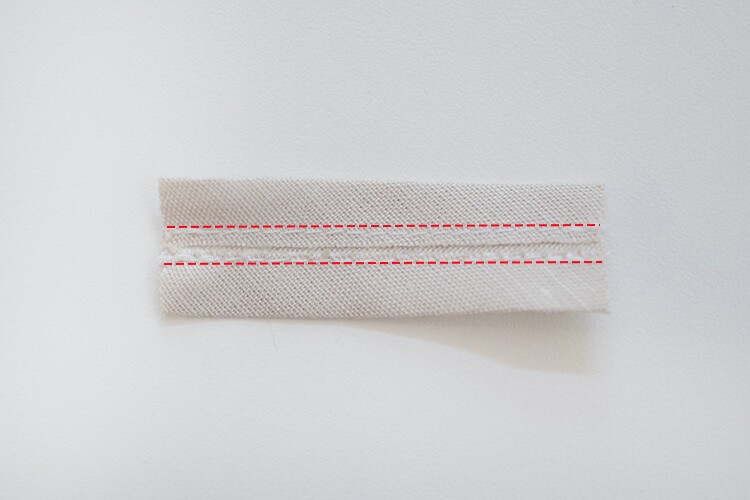 バイアステープ、もしくは共布でタブ作る場合は、布端を中心で合わせるように折り、ステッチをします。(写真参照)