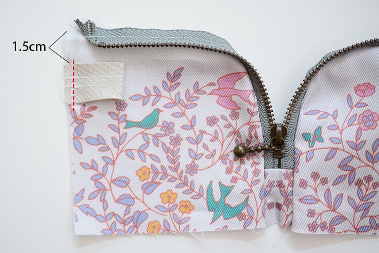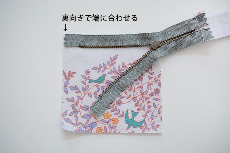 ファスナーをウラ向きにして、上耳を本体用布(オモテ面)の上角に合わせます。