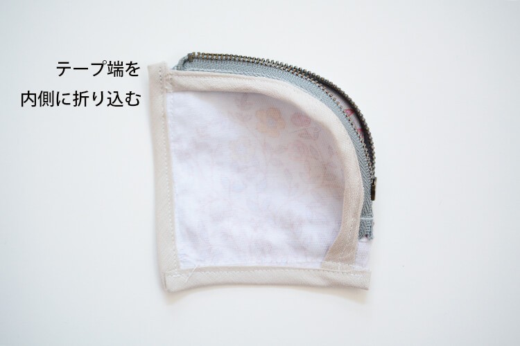 ※布端をくるめる薄手のテープであればOKです。ここではバイヤステープを使っています。
