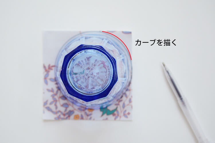 本体用布の角に小さめのコップを置いて型にし、チャコペンでなぞります。