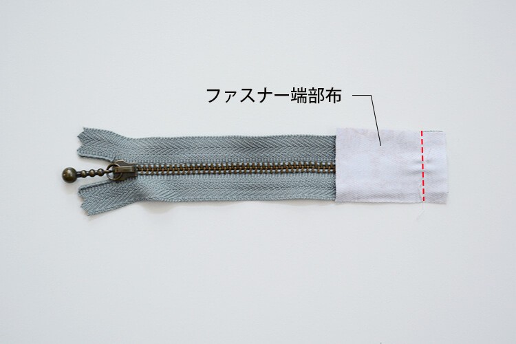 ファスナーの下耳にファスナー端用布を中表で重ね、ぬいしろ1cmで縫い合わせます。