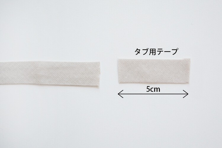 タブを半分に折り、片方の本体用布の、上から1.5cmのところに縫い付けます。(写真参照)