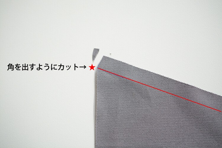 まち針やクリップで固定したら、斜め部分をぬいしろ1cmで縫い合わせます。