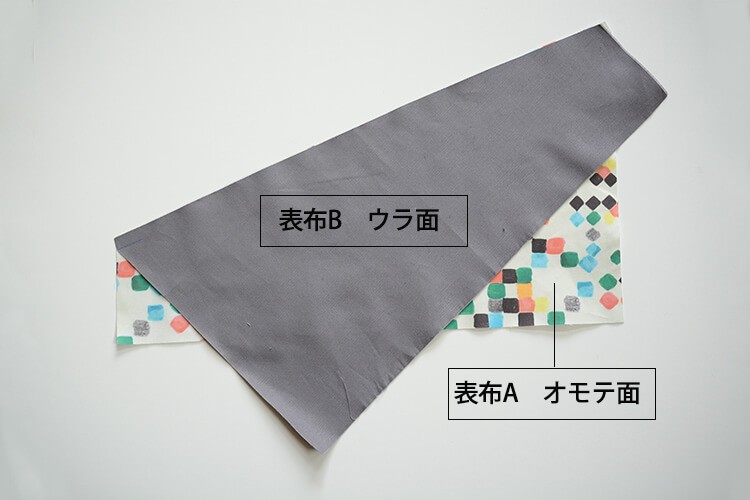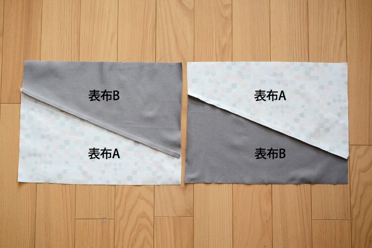 表布AとBの斜め部分を合わせ、中表で重ねます。