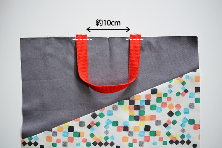 左右対称の位置に間隔を10cmほどあけて、上端から1cmほど出して縫いましょう。