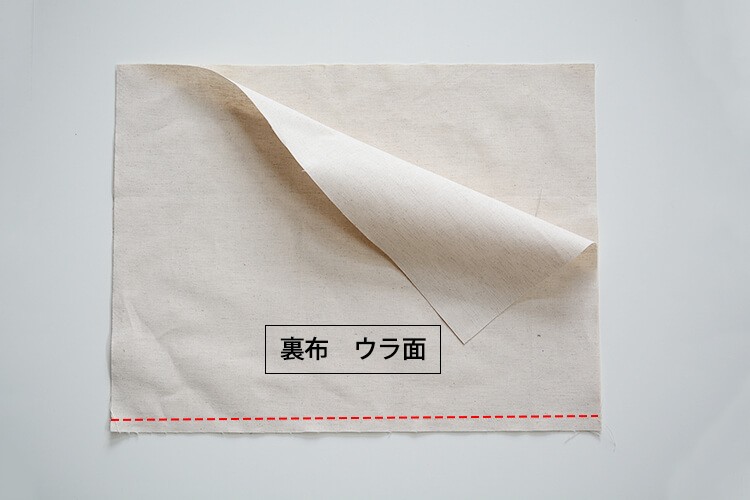 裏布も同様に中表で重ね、底部分をぬいしろ1cmで縫い合わせます。
