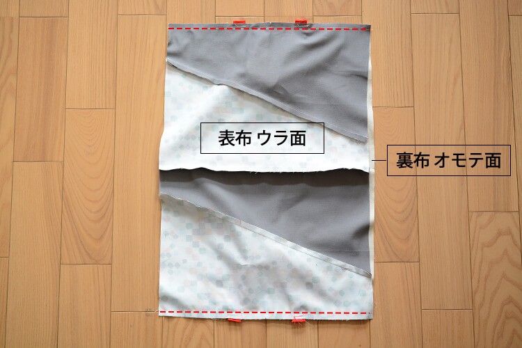 表布同士・裏布同士が合わさるようにたたみ直し、袋口の縫い目同士をしっかりとあわせてまち針やクリップで固定します。