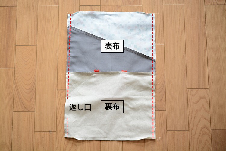 表布と裏布をそれぞれ開いて中表で重ね、袋口部分をぬいしろ1cmで縫い合わせます。