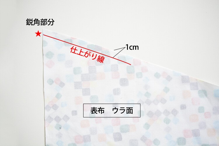 表布のウラ面に、斜め部分の仕上がり線をチャコペンでひきます。