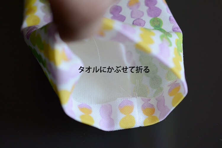 筒状になっていることろを開き、タオル地を折り目に合わせます。