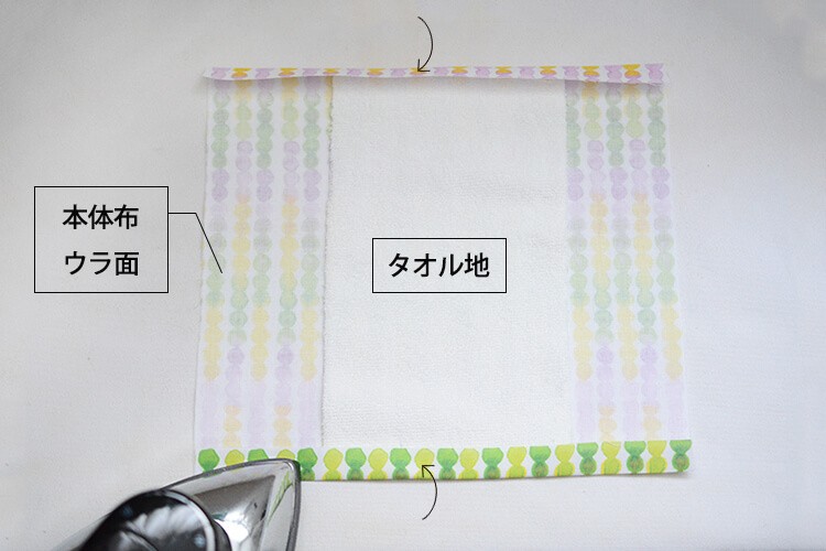 本体布の中心にタオル地を置き、タオル端に合わせて上下布端を内側に折り(1.5cm)、アイロンでしっかりと折り目をつけます。