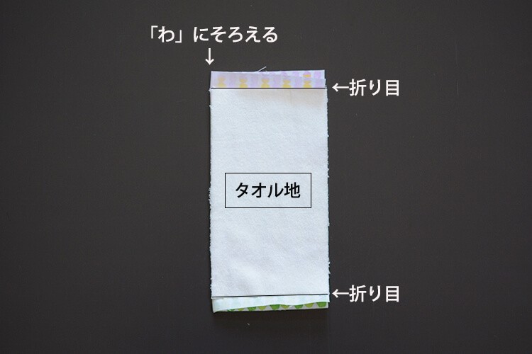 【point】この時、ヨコ辺は本体布の折り目に、タテ辺は「わ」の方にタオル地の布端をぴったりとそろえましょう。