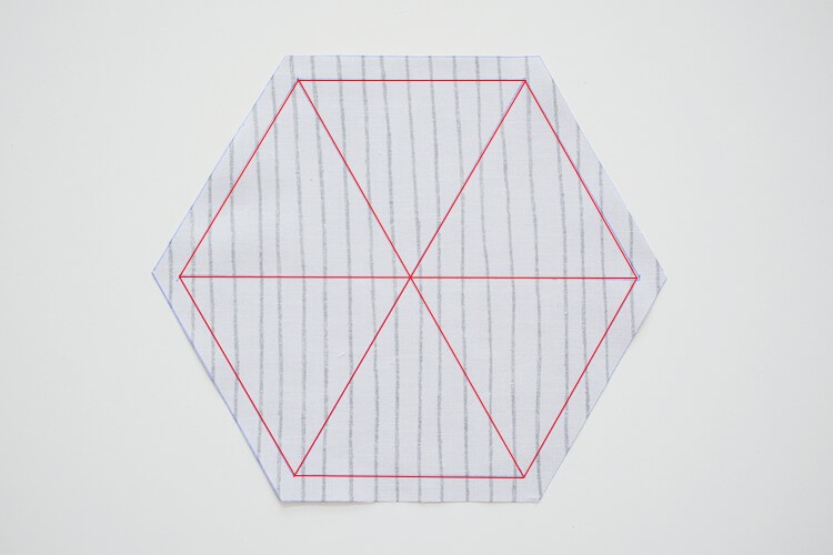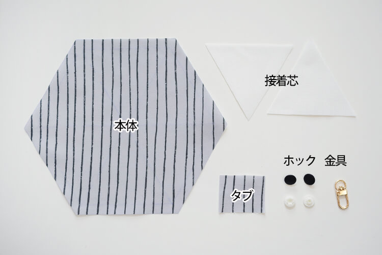 しかも、六角形の1枚の布を、隣同士の辺を3回直線縫いするだけで、裏地付きのふたつき三角ポーチが完成しちゃうんです。