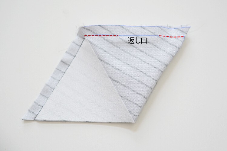 タブを縫い付けた辺と、その隣の辺を合わせるように中表で折り、ぬいしろ1cmで縫い合わせます。