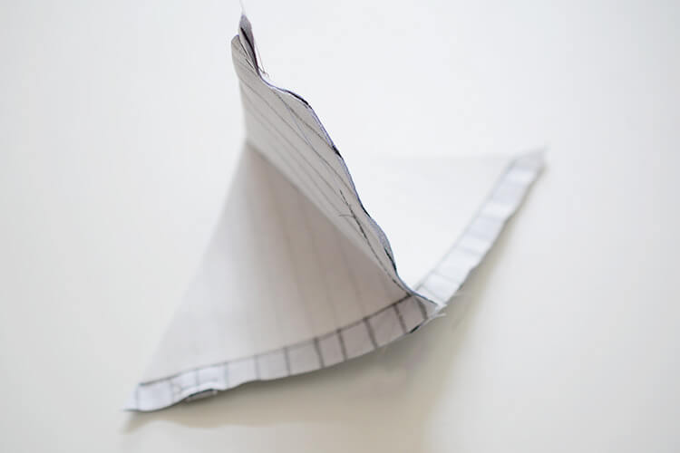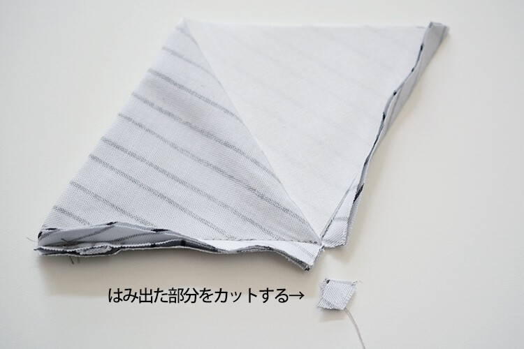 角のぬいしろがはみ出す部分をカットします。
