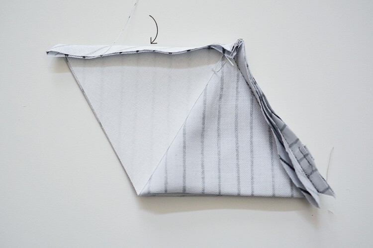 最後に、接着芯を貼っていない辺と隣の辺を合わせるように中表で折り、ぬいしろ1cmで縫い合わせます。