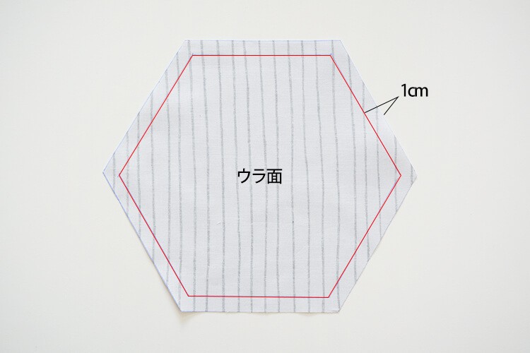 本体用布のウラ面に、チャコペンで型紙にそって線をひき、そこから1cmぬいしろをとってカットします。