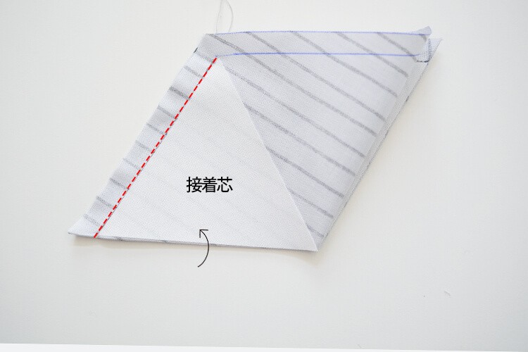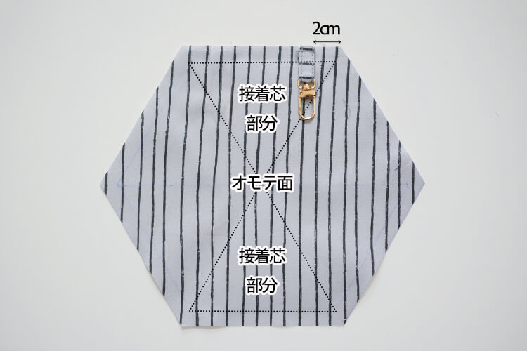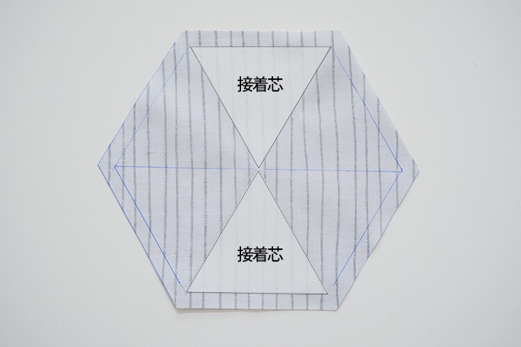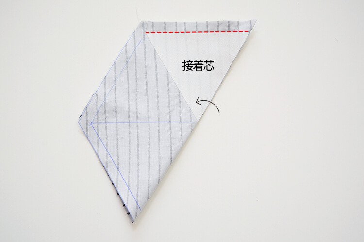 チャコペンで描いた三角の形に合わせ、対角になる2か所に接着芯を貼ります。