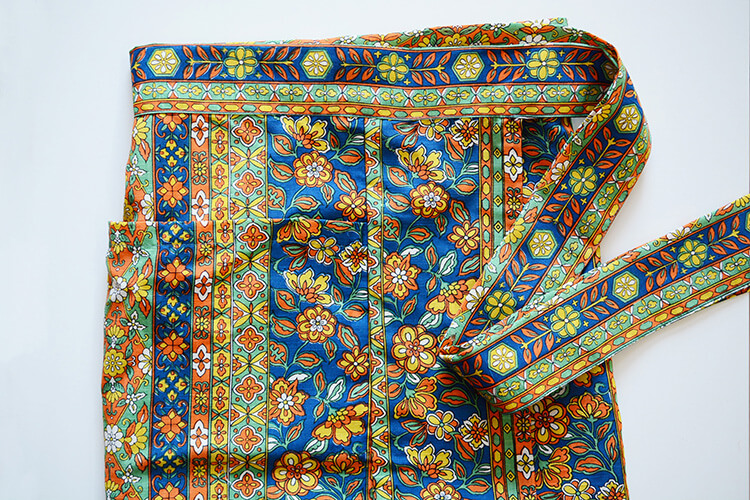 着物の下半分を全て使い、衿を腰ひもにして作りました。